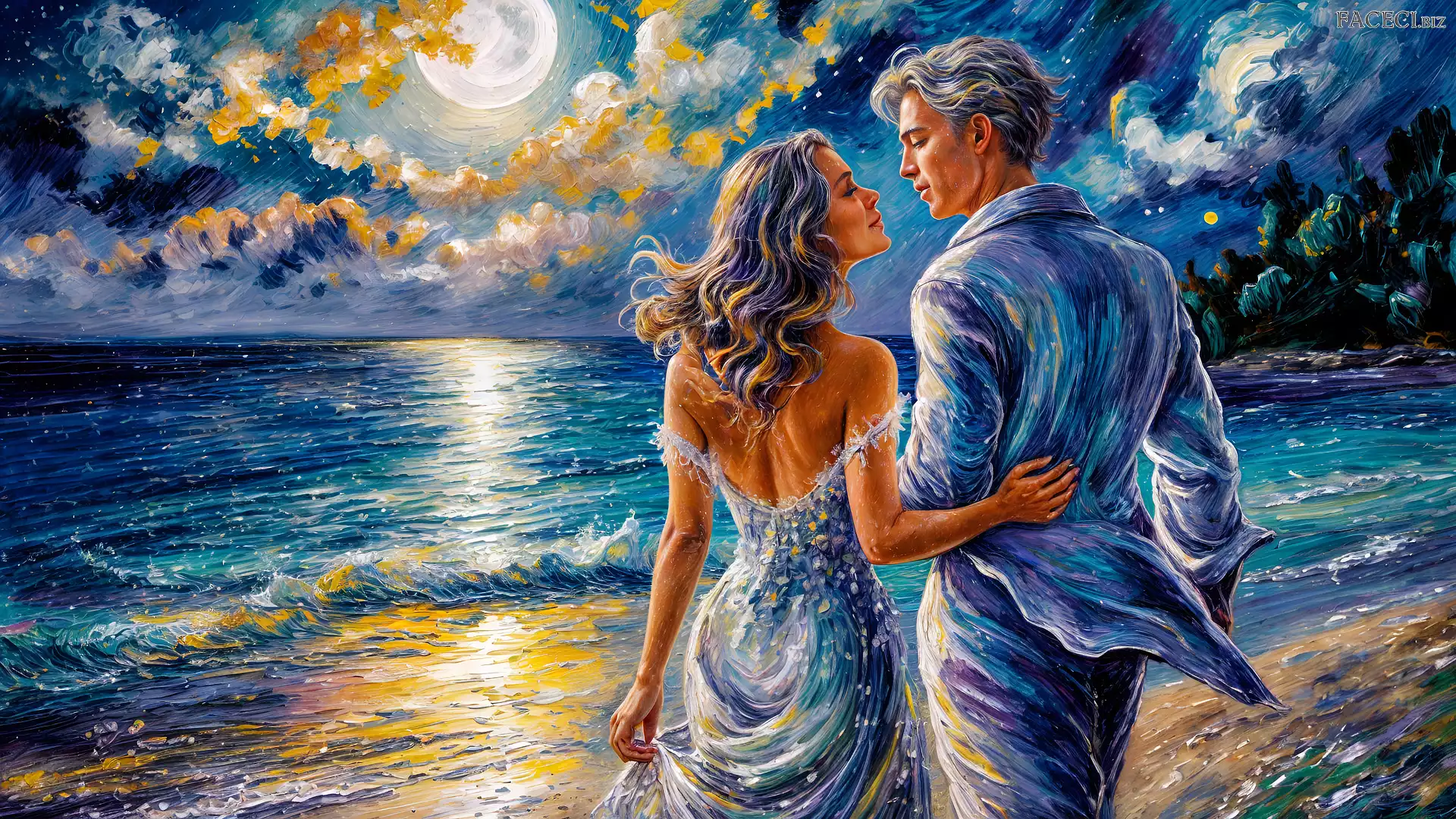 Kobieta, Grafika, Mężczyzna, Para, Grafika, Zakochani, Księżyc, Morze - faceci.biz